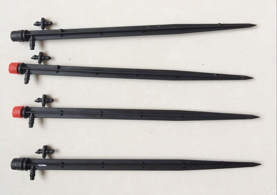 地插微噴組合中,常用的插桿長度為50公分左右,上部通過山字形轉(zhuǎn)換接頭將微噴頭、毛管及插桿相連接,毛管另一側(cè)通過毛管雙接頭與PE管連接。最后將插桿插入土壤固定好,地插微噴組合便完成了安裝。
